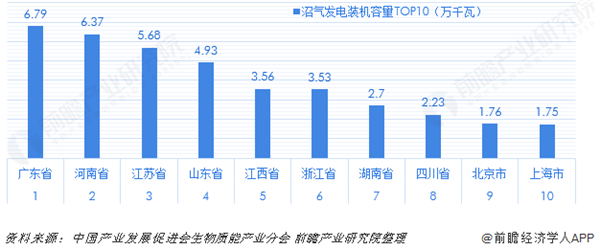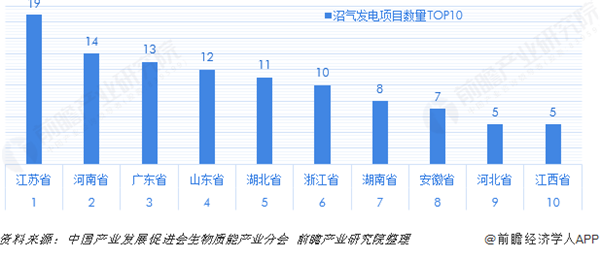 整體規(guī)模較小的沼氣發(fā)電項目擁有量最高的是江蘇省,項目數(shù)量達(dá)19個;排在第二名的是河南省,項目數(shù)量為14個;廣東省的項目數(shù)量為13個,排在第三位;山東、河北、浙江的項目數(shù)量均在10個以上,其余省市的項目數(shù)量較少。