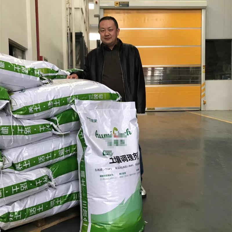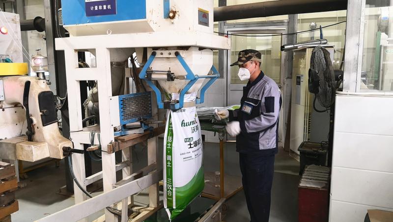 濕垃圾廠的工人打包土壤調(diào)節(jié)劑