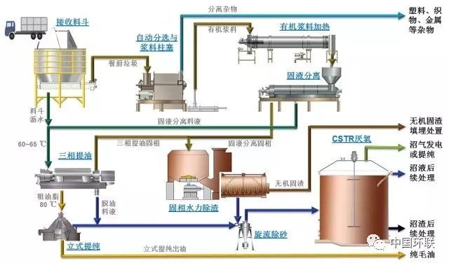 工藝核心:“精細(xì)化預(yù)處理+高效油水分離”,通過機械分選,確保進入提油系統(tǒng)的有機物料均質(zhì)化,通過機械離心的方式最大程度提取出廢油脂,漿料則進入后端厭氧系統(tǒng)產(chǎn)沼。
