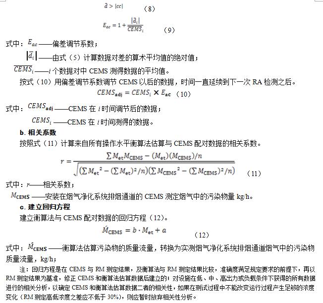 由排放系數(shù)計算煙氣凈化之后污染物的排放量(物料衡算法,簡稱衡算法),同時用RM和CEMS法測定污染物排放量。由衡算法與RM的相對準確度(RA)及CEMS法與RM的RA,分別判定衡算法和CEMS法的測定結(jié)果,當RA≤25%時,測定結(jié)果可采用(如果與RM數(shù)據(jù)對差的算術(shù)平均值大于置信系數(shù),則應(yīng)用偏差系數(shù)修正衡算法和/或CEMS法的數(shù)據(jù))。建立衡算法估算污染物的排放量與CEMS法測定數(shù)據(jù)的回歸方程,回歸方程的相關(guān)系數(shù)應(yīng)≥0.75。此后,將衡算法估算的污染物小時質(zhì)量流量(kg/h)代入回歸方程,獲得的結(jié)果與CEMS在相應(yīng)時間測定污染物質(zhì)量流量(kg/h)比較,相對誤差≤25%,判定CEMS測定數(shù)據(jù)可接收。