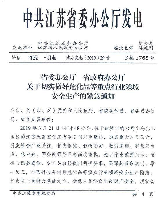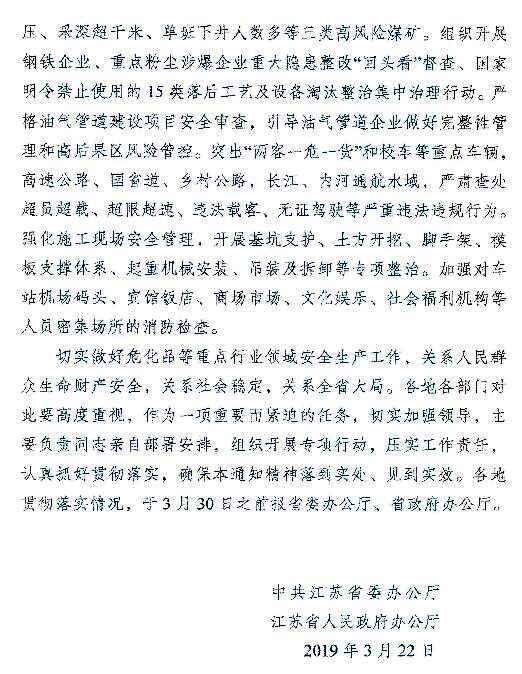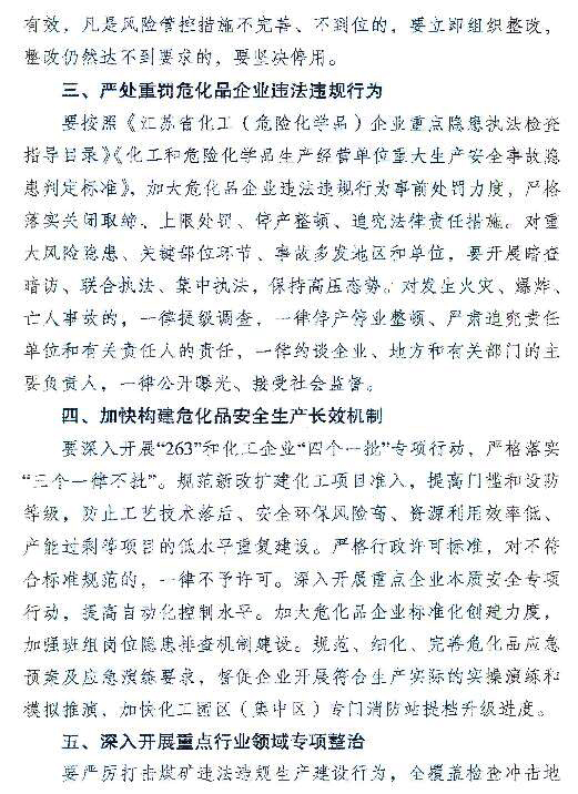 江蘇省發(fā)布《關于切實做好?;返戎攸c行業(yè)領域安全生產的緊急通知》,要深入開展“263”和化工企業(yè)“四個一批”專項行動,嚴格落實“三個一律不批”。規(guī)范新改擴建化工項目準入,提高門檻和設防等級,防止工藝技術落后、安全環(huán)保風險高、資源利用效率低、產能過剩等項目的低水平重復建設。嚴格行政許可標準,對不符合標準規(guī)范的,一律不予許可。深入開展重點企業(yè)本質安全專項行動,提高自動化控制水平。