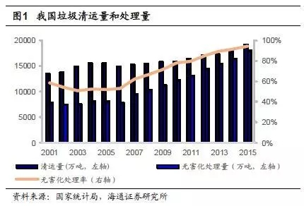 我國(guó)56.1%的城鎮(zhèn)化率依然遠(yuǎn)低于發(fā)達(dá)國(guó)家,在新型城鎮(zhèn)化戰(zhàn)略的推進(jìn)下,預(yù)計(jì)未來(lái)城鎮(zhèn)人口將保持穩(wěn)步增長(zhǎng),假設(shè)“十三五”期間垃圾清運(yùn)量每年保持3.27%的增速,垃圾無(wú)害化處理率為95%,則“十三五”期間垃圾無(wú)害化處理缺口5300萬(wàn)噸,垃圾處理能力有待進(jìn)一步提高。