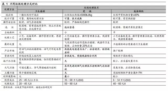 目前衛(wèi)生填埋處理占主導(dǎo)地位,長(zhǎng)期看焚燒處理優(yōu)勢(shì)明顯、增速較快。常見(jiàn)的垃圾無(wú)害化處理方式有衛(wèi)生填埋、焚燒和高溫堆肥。其中,我國(guó)垃圾焚燒處理量占比從2006年的14.45%上升到2015年的34.28%,2015年焚燒處理量為6176萬(wàn)噸,處理能力為21.9萬(wàn)噸/日(約8000萬(wàn)噸/年);衛(wèi)生填埋占比從2006年的81.4%下降到2015年的63.75%,2015年處理量為11483萬(wàn)噸,處理能力為34.4萬(wàn)噸/日(約12600萬(wàn)噸/年),而近年高溫堆肥處理量極少,2015年僅為354萬(wàn)噸。垃圾焚燒與填埋法相比,經(jīng)濟(jì)效益和環(huán)境保護(hù)程度更高:①減量縮容:在垃圾經(jīng)過(guò)焚燒后,一般可減重80%,減容90%以上,節(jié)約大量的土地資源;②資源再利用:按熱值比較,每噸生活垃圾約相當(dāng)于0.2-0.25噸標(biāo)準(zhǔn)煤,垃圾焚燒發(fā)電的資源綜合利用效益相當(dāng)可觀;③污染弱:垃圾焚燒主要產(chǎn)生的氣體為二氧化碳。因而垃圾焚燒成為近年來(lái)國(guó)家推崇的無(wú)害化處理方式,在垃圾無(wú)害化處理中的占比逐年上升。