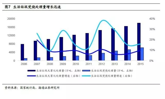 生活垃圾焚燒處理量增速高于無(wú)害化處理整體水平,“十三五”期間有望延續(xù)高增長(zhǎng)。我國(guó)生活垃圾焚燒處理量增長(zhǎng)迅速,從2006年的1138萬(wàn)噸增長(zhǎng)至2015年的6176萬(wàn)噸,十年間復(fù)合增速高達(dá)20.68%,遠(yuǎn)高于生活垃圾無(wú)害化處理領(lǐng)域整體9.63%的復(fù)合增速。行業(yè)在經(jīng)歷了2012、2013年的高速增長(zhǎng)后,2014、2015年增速略有下滑,2015年生活垃圾焚燒處理量增速為15.87%,處理能力增速為17.8%,整個(gè)“十二五”期間焚燒處理量復(fù)合增速24.15%,根據(jù)《“十三五”全國(guó)城鎮(zhèn)生活垃圾無(wú)害化處理設(shè)施建設(shè)規(guī)劃》,到2020年生活垃圾焚燒處理能力將達(dá)到59.14萬(wàn)噸/日,十三五期間生活垃圾焚燒處理能力復(fù)合增速將達(dá)到22%,行業(yè)高增長(zhǎng)有望延續(xù)。
