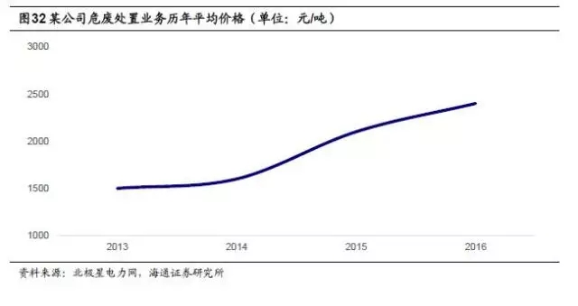 危廢處置價(jià)格穩(wěn)步上升,市場(chǎng)空間巨大。從核準(zhǔn)經(jīng)營(yíng)規(guī)模看,危廢處置產(chǎn)能緊缺,2015年核準(zhǔn)處置規(guī)模僅982.4萬(wàn)噸/年。近年來(lái),危廢處置價(jià)格呈現(xiàn)穩(wěn)步上升趨勢(shì)。以行業(yè)內(nèi)某領(lǐng)先企業(yè)為例,2013年,其危廢處置業(yè)務(wù)平均價(jià)格為1500元/噸左右,2016年則上升至2500元/噸左右。以全國(guó)環(huán)境統(tǒng)計(jì)公報(bào)數(shù)據(jù)為基礎(chǔ),假設(shè)未來(lái)幾年危廢產(chǎn)生量保持過(guò)去十年復(fù)合增長(zhǎng)率12%的增速,保守估計(jì)處置率為35%,單位處置成本為2500元/噸,則預(yù)計(jì)2020年危廢處置市場(chǎng)為613億元,2017-2020處置市場(chǎng)空間總計(jì)2086億元。考慮到還有大量的危廢沒(méi)有進(jìn)入國(guó)家統(tǒng)計(jì)口徑,若將這些量考慮在內(nèi),市場(chǎng)空間還將提升2-3倍。