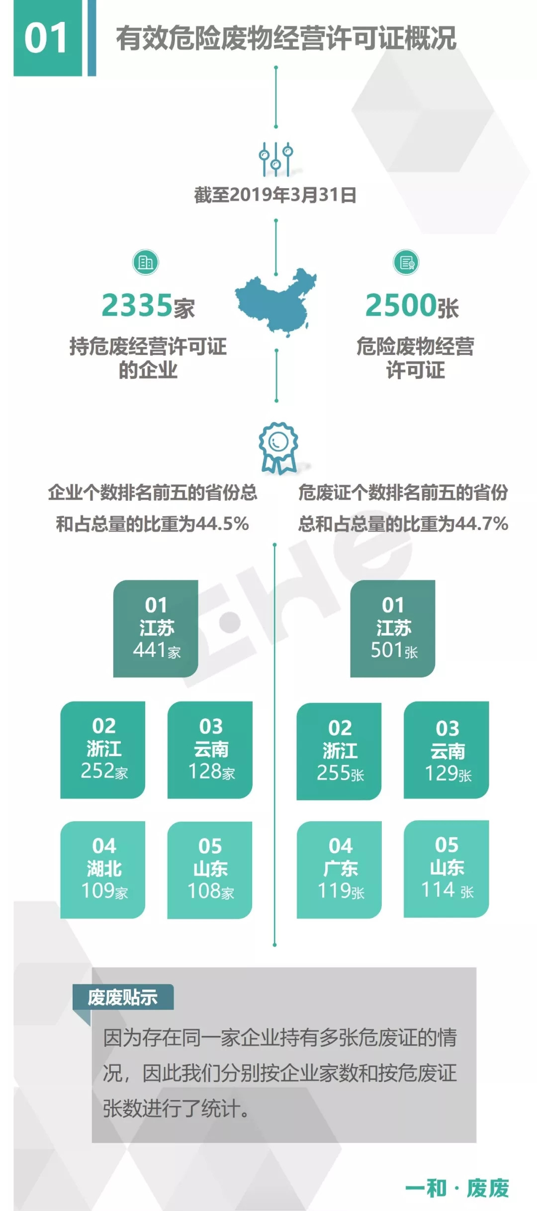 為方便危廢行業(yè)人員了解全國(guó)危廢經(jīng)營(yíng)許可證情況,特將2019年3月全國(guó)危險(xiǎn)廢物經(jīng)營(yíng)許可證統(tǒng)計(jì)概況公布如下: