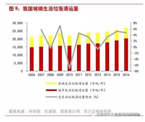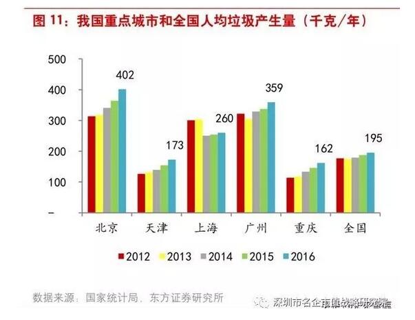 經(jīng)濟(jì)發(fā)展和城鎮(zhèn)化帶來的人均生活垃圾產(chǎn)量的不斷提高;根據(jù)國(guó)家統(tǒng)計(jì)局?jǐn)?shù)據(jù),2016 年我國(guó) 人均垃圾產(chǎn)生量為 195 千克/年。我國(guó)幾個(gè)重點(diǎn)城市之間差別比較大,其中北京的人均垃圾產(chǎn) 生量最高,達(dá)到 402 千克/年,重慶的人均垃圾產(chǎn)生量最低,為 162 千克/年,經(jīng)濟(jì)較發(fā)達(dá)且城 鎮(zhèn)率高的城市人均垃圾產(chǎn)生量也較高。參考國(guó)外,美國(guó)的人均垃圾產(chǎn)生量為 657 千克/年,達(dá) 到我國(guó)平均的 3.3 倍。我們認(rèn)為隨著我國(guó)經(jīng)濟(jì)的發(fā)展和城鎮(zhèn)化推進(jìn),人均垃圾產(chǎn)生量仍有較大的提升空間。