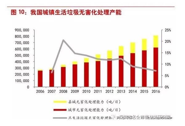 隨著我國(guó)經(jīng)濟(jì)發(fā)展、城鎮(zhèn)化水平提高及垃圾處理無害化處理率的提高,垃圾清運(yùn)量和無害化處理產(chǎn) 能每年穩(wěn)步增長(zhǎng)。2006-2016年間,我國(guó)城鎮(zhèn)生活垃圾清運(yùn)量由2.11億噸/年增長(zhǎng)至 2.70 億噸/年, 年均復(fù)合增長(zhǎng)率為 2.5%;我國(guó)城鎮(zhèn)生活垃圾無害化處理產(chǎn)能由 27.33 萬噸/日增長(zhǎng)至 81.20 萬噸/ 日,年均復(fù)合增長(zhǎng)率為 11.5%。與此同時(shí),我國(guó)生活垃圾無害化處理率也不斷提高。2016 年,我 國(guó)城鎮(zhèn)生活垃圾無害化處理率達(dá)到 94%,其中城市生活垃圾無害化處理率達(dá)到 96.6%,縣城無害 化處理率為 85.2%。