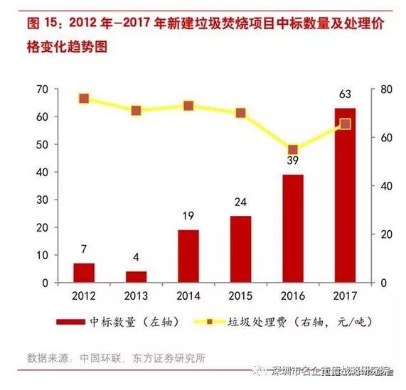 2) 垃圾焚燒處理費(fèi)價(jià)格穩(wěn)中有升:根據(jù)中國(guó)環(huán)聯(lián)的數(shù)據(jù)統(tǒng)計(jì),2012-2017 年,全國(guó)每年垃圾焚 燒項(xiàng)目招標(biāo)的數(shù)量逐漸增多。但在這個(gè)期間出現(xiàn)了惡性競(jìng)爭(zhēng),甚至有過以 20-30 元/噸超低價(jià) 中標(biāo)的極端情況,而行業(yè)普遍認(rèn)為的垃圾焚燒處理合理的價(jià)格區(qū)間應(yīng)為 60-80 元/噸。地方政 府在項(xiàng)目招標(biāo)時(shí)采用最低價(jià)中標(biāo)的方式,以及部分競(jìng)爭(zhēng)力有限的公司希望以低價(jià)投標(biāo)的策略迅 速搶占市場(chǎng)、擴(kuò)張規(guī)模,造成了2012-2016 年垃圾焚燒處置費(fèi)持續(xù)下降,2016 年全年中標(biāo)均 價(jià)僅為 54.85 元/噸。2017 年,價(jià)格止跌回升,增長(zhǎng)至 65.44 元/噸,項(xiàng)目的招標(biāo)數(shù)量也增加 至 63 個(gè)(2015、2016 年分別為 24 和 39 個(gè))。我們認(rèn)為隨著環(huán)保要求不斷提升,部分資金 和運(yùn)營(yíng)實(shí)力有限的公司正在逐步退出垃圾焚燒運(yùn)營(yíng)市場(chǎng),垃圾焚燒處理價(jià)格將維持在合理的水 平。上海環(huán)境、偉明環(huán)保等垃圾焚燒上市公司 2018 年新中標(biāo)的項(xiàng)目垃圾處理費(fèi)普遍在70-100 元/噸左右。