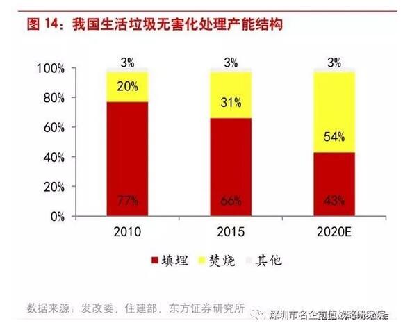 傳統(tǒng)的垃圾無害化處理主要有三種方式:衛(wèi)生填埋、堆肥以及焚燒。相較于其他的處理方式,垃圾 焚燒能更有效的實(shí)現(xiàn)“減量化、資源化、無害化”。由于填埋用地緊張,環(huán)保排放要求提高,焚燒 正在成為生活垃圾處理的主要方式。2010 年以后相關(guān)政策持續(xù)落地,生活垃圾焚燒行業(yè)步入高速 發(fā)展期:2010 年發(fā)改委明確提出推廣城市生活垃圾發(fā)電技術(shù);2011 年發(fā)改委、環(huán)保部等要求土地 資源緊缺、人口密度高的城市要優(yōu)先采用焚燒處理技術(shù);2012 年,發(fā)改委發(fā)布《關(guān)于完善垃圾焚 燒發(fā)電價(jià)格政策的通知》確定垃圾焚燒發(fā)電執(zhí)行全國(guó)標(biāo)桿電價(jià)每千瓦時(shí) 0.65 元,從國(guó)家層面上明 確垃圾焚燒發(fā)電補(bǔ)貼標(biāo)準(zhǔn);同年城鎮(zhèn)生活垃圾十二五規(guī)劃發(fā)布;2016 年城鎮(zhèn)生活垃圾十三五規(guī)劃 發(fā)布,其中提到要新增垃圾焚燒處理能力 35.6 萬噸/日。