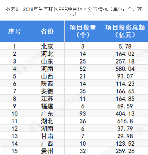 從各省的PPP項目分布來看,2018年入庫PPP項目數(shù)共計4033個,落地項目1285個,落地率為32%。入庫生態(tài)環(huán)保PPP項目數(shù)466個,投資總額4607.65億元,其中落地項目188個,投資總額1855.21億元,落地率40%。其中,廣東省項目數(shù)量最多,達到了93個。湖北省的項目投資總額最高,高達661.8億元。生態(tài)環(huán)保PPP項目的落地率高于平均水平。