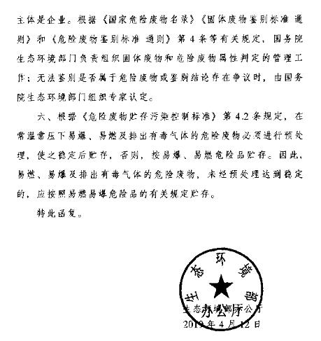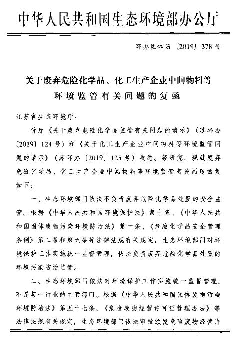 日前,生態(tài)環(huán)境部辦公廳公布關(guān)于廢棄危險化學(xué)品、化工生產(chǎn)企業(yè)中間物料等環(huán)境監(jiān)管有關(guān)問題的復(fù)函。其中指出: