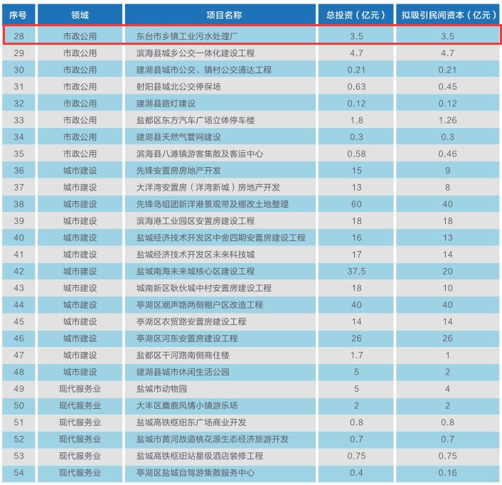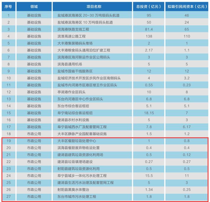 5月7日,鹽城市政府召開2019年鹽城市重大項目向民間資本(社會資本)開放新聞發(fā)布會,面向民間資本(社會資本)推介項目100個,總投資1550億元,擬吸引民間投資996億元。涉及生活污水處理、餐廚垃圾處理等環(huán)保項目。