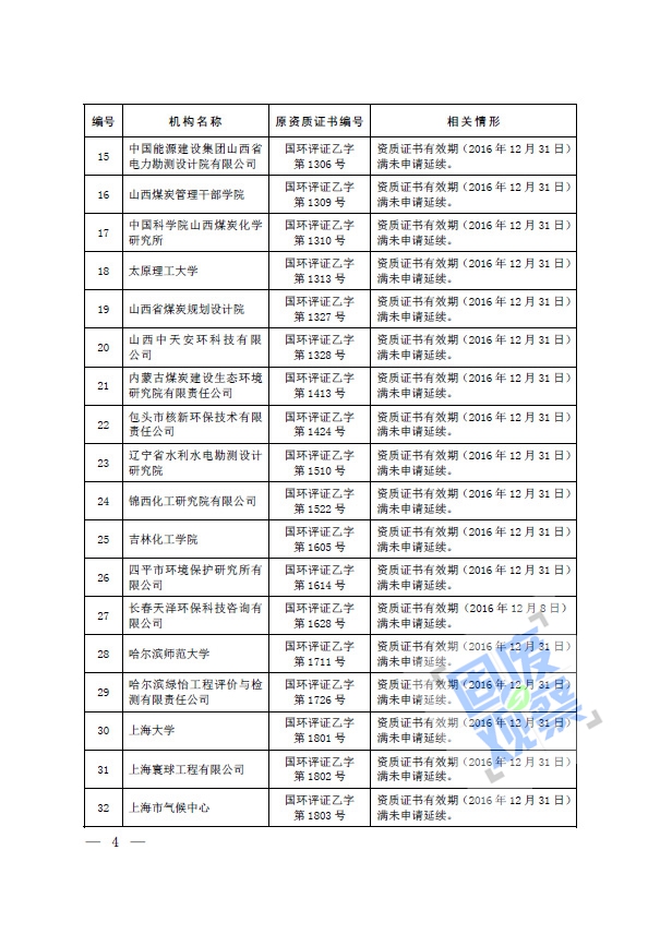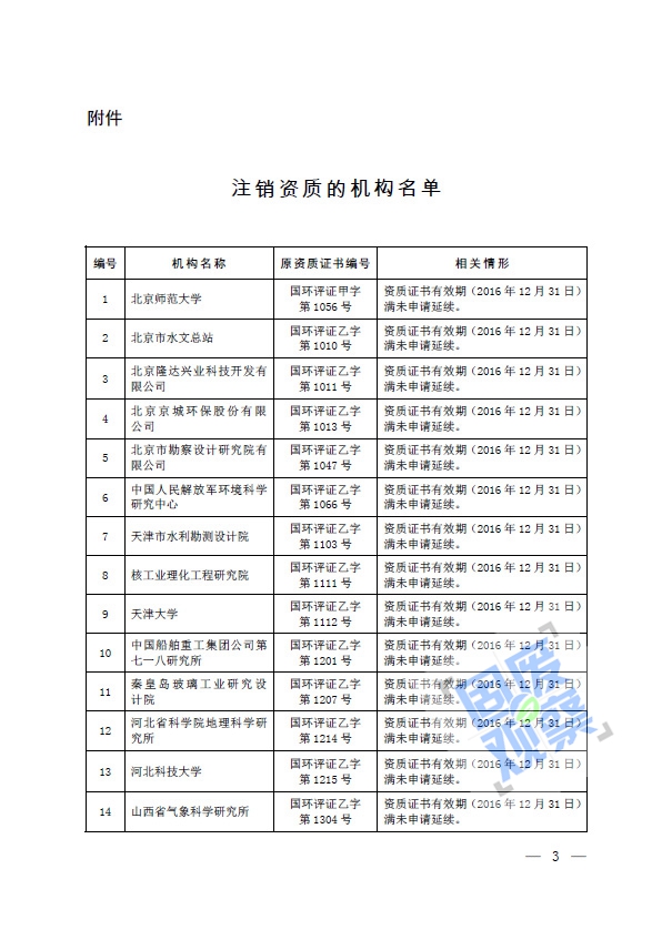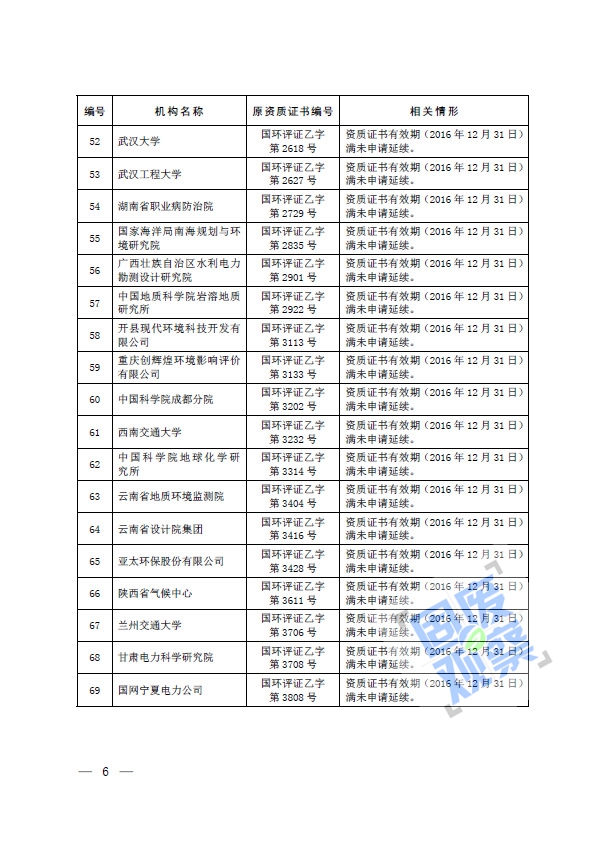 根據(jù)《建設(shè)項目環(huán)境影響評價資質(zhì)管理辦法》(環(huán)境保護(hù)部令第36號)的有關(guān)規(guī)定,我部對建設(shè)項目環(huán)境影響評價資質(zhì)(以下簡稱資質(zhì))證書有效期滿未申請延續(xù)的69家機(jī)構(gòu)資質(zhì)予以注銷(具體名單詳見附件)。