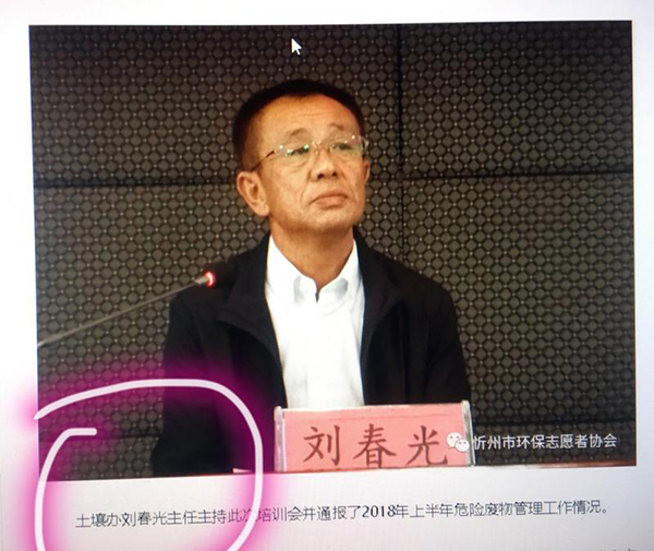 劉春光是山西省忻州市原環(huán)保局的一名工勤人員,曾被提拔成為該局機(jī)動(dòng)車尾氣檢測中心主任,2009年因“吃卡拿要”等問題被嚴(yán)重警告處分并免職;后又以“忻州市環(huán)保局土壤辦主任”的身份出現(xiàn)。
