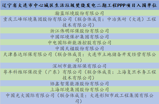 據(jù)中國(guó)固廢網(wǎng)跟蹤發(fā)現(xiàn),大連中心城區(qū)垃圾焚燒發(fā)電二期項(xiàng)目不僅日處理規(guī)模大,運(yùn)營(yíng)服務(wù)費(fèi)變動(dòng)挺大,由最高限價(jià)的76元/噸跌至11.11元/噸。早在2018年11月6日,該項(xiàng)目啟動(dòng)資格預(yù)審,11月30日,項(xiàng)目發(fā)布資格預(yù)審結(jié)果,瀚藍(lán)環(huán)境、三峰環(huán)境、中國(guó)環(huán)保、粵豐環(huán)保、上海環(huán)境、光大國(guó)際等在內(nèi)的12大名企集體入圍,具體名單如下: