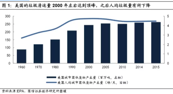 垃圾產生量的變化趨勢是影響垃圾處理量的直接因素。從上世紀 60 年代開始, 美國城市的固體廢物產生量開始以年化1.5%的速度快速增長了40年,總固廢產生量從1960年的8800萬噸增長到2000年的2.5億噸,而人均固廢產生量也從2.68磅/天增加到了4.75磅/天。美國的垃圾清運量2000年左右達到頂峰,之后由于回收比例的提升和人們環(huán)保意識的增長,人均垃圾量有所下降,到 2015 年美國人均產生 4.5 磅/天左右的固體廢棄物。