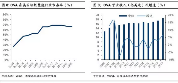 2004-2008 年間,CVA 快速崛起,市占率從 27%提升至 53%,成為美國垃圾 焚燒發(fā)電市場的龍頭。2010-2016 年這 7 年內 CVA 一直維持著近 70%的市占 率。2016 年,CVA 年垃圾處理能力約 2000 萬噸,占全美總年處理能力比重達到 67%。 2016 年底,CVA 擁有與經營 45 個垃圾焚燒發(fā)電廠,此外公司還 有 11 個額外能源發(fā)電設施,包括木材生物質與水力再生能源發(fā)電設施、18 個 轉運站、12 個環(huán)境服務設施、1 個區(qū)域金屬回收設施和 4 個垃圾填埋場。CVA 的垃圾焚燒發(fā)電廠處理垃圾能力達到了 5.5 萬噸/日,年處理能力達到了 2000 萬噸,約占美國固廢年產生量 8%,占美國年垃圾焚燒量的 67%。