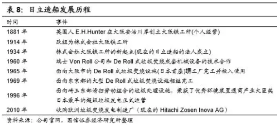 公司前身大阪安治川岸創(chuàng)立大阪鐵工所于 1881 年由一名叫 E.H.Hunter 的英國 人創(chuàng)立,之后公司經歷了改組,于 1934 年成立了日立造船。公司以制造業(yè)為 主,最初從事船舶、橋梁等海陸區(qū)域的制造服務。1960 年,日立造船與瑞士 Von Roll 公司開始垃圾焚燒技術合作,開啟了日立造船在垃圾焚燒領域的發(fā)展。 它是日本建設國內第一座垃圾焚燒發(fā)電設施的龍頭公司,與 Von Roll 一起向全 球范圍內提供垃圾焚燒發(fā)電設施。
