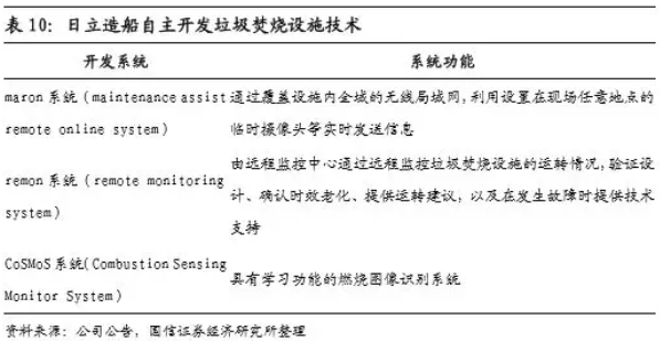 堅持研發(fā)更新,引領世界最先進垃圾焚燒設施技術。日立造船在垃圾焚燒發(fā)電 領域堅持自主研發(fā),不斷更新垃圾焚燒技術。2014-2017 年間研發(fā)費用也逐漸 上升,2017 年研發(fā)費用高達 70 億日元。從營業(yè)收入占比來看,日立造船近 4 年均維持 2%的水平。日立造船在垃圾焚燒領域的核心王牌,是自主開發(fā)的影像 認證系統(tǒng)和積累的大量焚燒爐運行數據。早在 2001 年和 2011 年,公司就已經 研發(fā)出maron系統(tǒng)和remon系統(tǒng),主要用于遠程監(jiān)控和實時共享圖像視頻信息, 為垃圾焚燒設施的正常運行提供保證。2013 年底,公司宣布開發(fā)出 CoSMoS 系統(tǒng),即具有學習功能的燃燒圖像識別系統(tǒng)。影像識別技術能夠精確識別、判 斷焚燒爐內火焰和垃圾的狀態(tài),并結合以往的計量數據來判斷和選擇焚燒爐最 適宜的燃燒方式,使各個焚燒設施實現了運行作業(yè)可視化、自動化,節(jié)省大量 人力成本、提升垃圾焚燒設施運轉效率。2015 年,公司運用 SPring-8 控制架 構"MADOCA II" 開發(fā)垃圾焚燒發(fā)電成套設備的大數據管理系統(tǒng),使公司的大數 據管理能力得到進一步提高。2017 年,公司為針對垃圾焚燒發(fā)電設施實行遠程 監(jiān)控,在總部建設了一座遠程監(jiān)控暨運營支持中心,以物聯網、大數據分析為基礎,強化垃圾焚燒發(fā)電設施的遠程監(jiān)控和運營支持能力,加強尖端信息技術的運用。