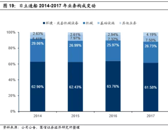 日立造船以環(huán)境和設備業(yè)務為主,公司堅持以制造為基礎,向多個領域延伸發(fā) 展,提供設施設備制造服務。公司業(yè)務由四部分組成:環(huán)境和成套機械設備、 機械、基礎設施和其他,業(yè)務范圍廣。其中,環(huán)境和成套機械設備板塊占比基 本維持在 60%的水平,其次是機械板塊,占比在 25%-30%之間。垃圾焚燒發(fā) 電設施是環(huán)境和設備板塊的重要組成部分。近五年,環(huán)境和設備板塊的營業(yè)收 入整體變動不大,增減幅在 10%以內,但營業(yè)利潤波動較大,2015 年達到峰 值,營業(yè)利潤為 148.19 億日元,2016-2017 年連續(xù)下降至 13.16 億日元,主要 受公司訂單量減少影響。
