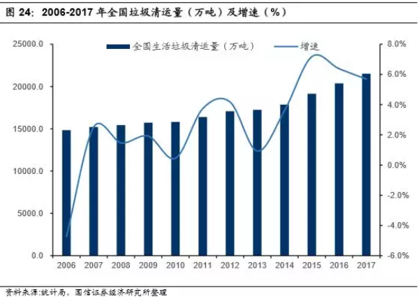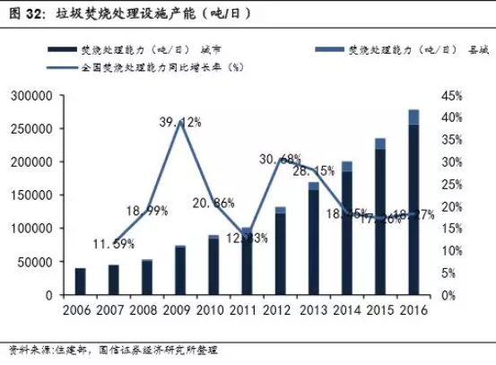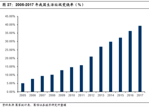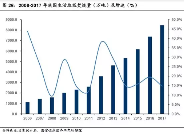 垃圾焚燒率目前不到 40%。從 2006 年到 2017 年生活垃圾清運量和生活垃圾 焚燒量的數據來看,2017 年全國生活垃圾清運量為 2.15 億噸,生活垃圾焚燒 量為 8463 萬噸,生活垃圾焚燒率為 39.33%。盡管焚燒率逐年提高,但總體仍 較低水平。