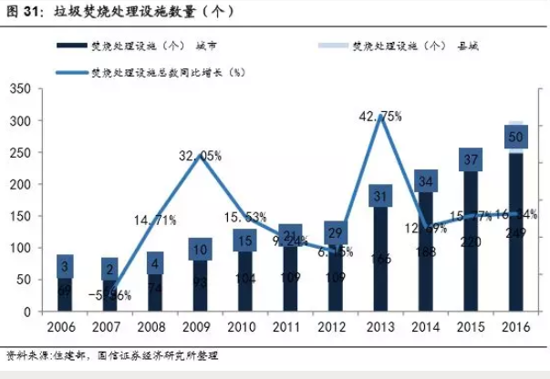 2016 年全國生活垃圾焚燒處理設施數量達到 299 個,同比增長 16.34%;生 活垃圾焚燒處理能力達到 27.82 萬噸/ 日,同比增長 18.28%。2012-2016 年 年均復合增速 20%左右。