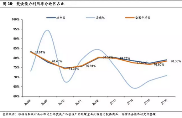 農村地區(qū)垃圾處理仍處于初級階段。根據住建部發(fā)布的《城鄉(xiāng)建設統(tǒng)計年鑒》,農 村地區(qū)現每年產生垃圾總量穩(wěn)定在 6600 萬噸以上,人均垃圾產生量穩(wěn)定處于 0.3 千克/天的水平。2016 年農村人口占總人口的43%,農村的人均垃圾產生量和垃圾 清運比例有巨大的提升空間,所以考慮經濟發(fā)展和農村垃圾清運比例的提升,我國 的垃圾焚燒市場未來空間仍然十分廣闊。