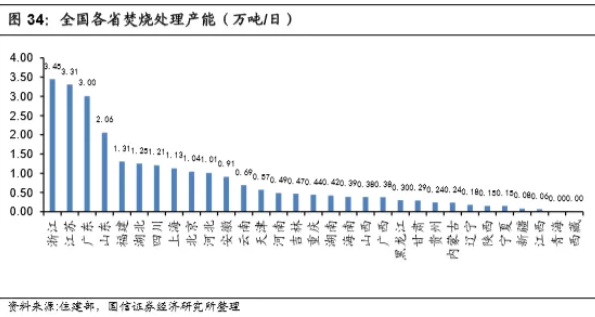 從垃圾焚燒產能分部來看,浙江、江蘇、廣東三省垃圾焚燒產能超過 3 萬噸/日, 甘肅、貴州、內蒙古、遼寧、陜西、寧夏、新疆、江西 8 省垃圾焚燒產能不足 3000 噸/日,而青海和西藏更是尚無垃圾焚燒項目。