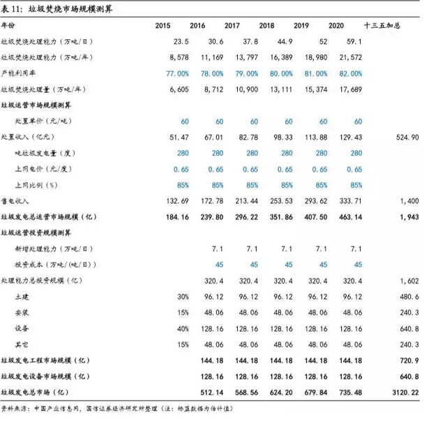 預計“十三五”期間,垃圾焚燒總市場規(guī)模達 3120 億。《“十三五”全國城鎮(zhèn)生 活垃圾無害化處理設施建設規(guī)劃》提出,到 2020 年全國垃圾焚燒處理能力達 到 59.14 萬噸/日,占無害化處理能力的比例達到 54%。1)根據國家“十三 五規(guī)劃”,假設 2016-2020 年每年新增 7.1 萬噸/日焚燒處理能力,項目產能利 用率 80%、噸垃圾處置費 60 元/噸、噸垃圾發(fā)電量 280 度、上網電價 0.65 元/ 度、上網比例 85%,則垃圾焚燒發(fā)電運營市場規(guī)模將達到 1943 億。2)假設噸 垃圾投資額 45 萬/(噸/日),則對應 2016-2020 年每年垃圾焚燒總投資約 320億。假設焚燒發(fā)電項目投資中,土建、安裝、設備及其它分別占總投資的比例 為 30%、15%、40%、15%,則 2016-2020 年垃圾發(fā)電工程市場規(guī)模為 144 億,設備市場規(guī)模為 128 億,十三五期間垃圾焚燒發(fā)電總工程就設備市場規(guī)模 分別為 721 億、641 億。綜合考慮工程、設備及運營市場,“十三五”期間垃圾 焚燒總市場規(guī)模達到 3120 億。