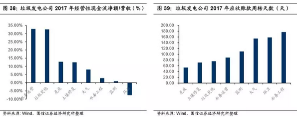 垃圾焚燒發(fā)電行業(yè)的項目屬于運營類資產,項目投運之后每年可以獲得穩(wěn)定的垃圾 處置收入和電費收入,因此現金流情況良好。與環(huán)保其它板塊相比,垃圾焚燒發(fā)電 行業(yè) 2018 年經營性現金流/營業(yè)收入比例為 32.57%,在環(huán)保所有子行業(yè)中位列第二,僅次于水務運營行業(yè)。從應收賬款周轉天數來看,垃圾焚燒發(fā)電行業(yè) 2017 年周轉天數為 76 天,在環(huán)保所有子行業(yè)中排名第三,僅次于危廢和土壤修復行業(yè),應收賬款周轉較快。