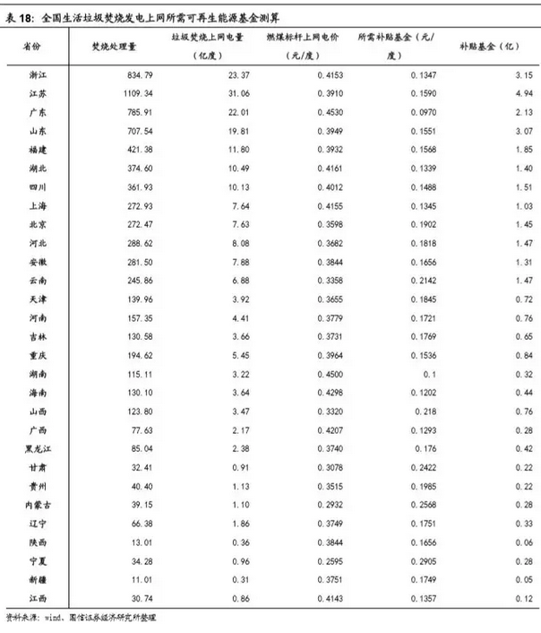 第三,市場擔憂垃圾焚燒發(fā)電上網電價會下調。我們對垃圾焚燒發(fā)電上網電價補貼占可再生能源基金支出的占比情況進行了詳細分析,發(fā)現垃圾焚燒發(fā)電所 需的補貼基金在國家可再生能源補貼基金中占比僅 5.4%。目前全國各地仍處于垃圾焚燒處置占比急需提升的階段,且垃圾焚燒發(fā)電的垃圾減量化效果明顯, 是化解“垃圾圍城”問題的重點途徑,因此我們認為短期垃圾焚燒上網電價補 貼下調的可能性很小。