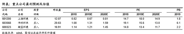 ③ 上海環(huán)境未來看點主要在于:1)水務和危廢資產注入;2)垃圾焚燒發(fā)電2020 年將迎來項目投運高峰期,垃圾焚燒業(yè)務有望明顯放量;3)污水業(yè)務提標改 造帶來的增量空間;4)可能的外延收購及新興領域的市場拓展。預計公司 2019-2021 年實現歸母凈利潤 5.83/7.08/8.13 億,對應 PE19/16/14 倍,給予 “買入”評級。