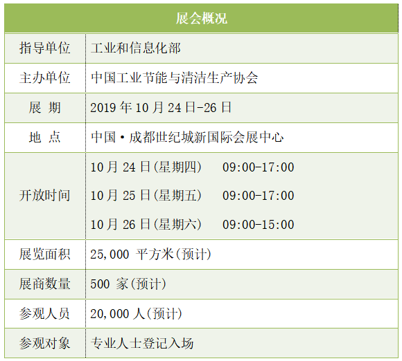 為踐行綠色發(fā)展理念,展示近年來先進(jìn)的節(jié)能環(huán)保技術(shù)、工藝、產(chǎn)品、裝備以及綠色制造領(lǐng)域取得的成果,推進(jìn)先進(jìn)技術(shù)、工藝的交流與合作,實(shí)現(xiàn)技術(shù)、產(chǎn)品、裝備的推廣和交易,在工業(yè)和信息化部的指導(dǎo)下,中國工業(yè)節(jié)能與清潔生產(chǎn)協(xié)會茲定于2019年10月24日至26日在成都舉辦2019(第六屆)中國國際節(jié)能環(huán)保技術(shù)裝備展示交易會。