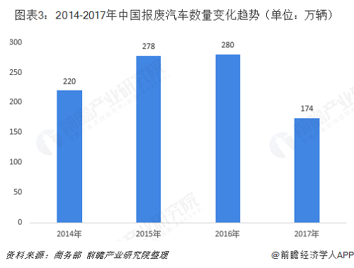 根據(jù)商務(wù)部最新統(tǒng)計(jì)數(shù)據(jù)顯示,2017年我國汽車報(bào)廢數(shù)量為174萬輛。我國整體汽車報(bào)廢率較低,明顯低于發(fā)達(dá)國家6%-8%的水平。