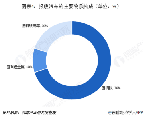 眾所周知,報(bào)廢汽車所含的有價(jià)資源較多。報(bào)廢汽車主要含有黑色金屬、有色金屬、貴金屬(催化劑)、電子設(shè)備、玻璃、車用塑料等。其中,廢鋼等黑色金屬約占70%,銅鋁等有色金屬約占10%,其他物料約占20%。其中廢鋼鐵、有色金屬90%以上都可以回收利用,玻璃、塑料等的回收利用率也可達(dá)50%以上??梢妶?bào)廢汽車的再回收利用價(jià)值較大。