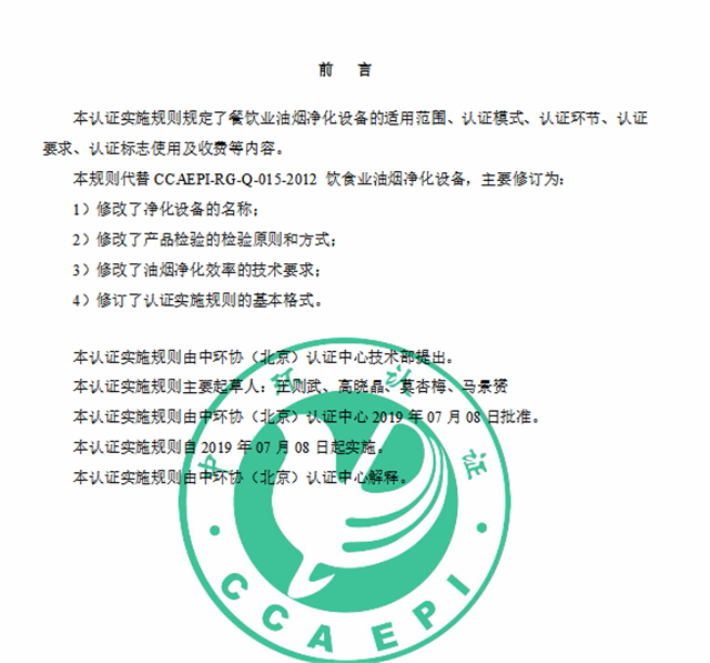為改善環(huán)境空氣質(zhì)量,加強(qiáng)餐飲業(yè)油煙及其他大氣污染物排放控制,促進(jìn)餐飲業(yè)污染控制技術(shù)進(jìn)步,日前,中環(huán)協(xié)(北京)認(rèn)證中心修訂了《環(huán)境保護(hù)產(chǎn)品認(rèn)證實(shí)施規(guī)則 餐飲業(yè)油煙凈化設(shè)備》(CCAEPI-RG-Q-015-2019),新制訂了《環(huán)境保護(hù)產(chǎn)品認(rèn)證實(shí)施規(guī)則 餐飲業(yè)污染物(油煙、顆粒物、非甲烷總烴、臭氣)協(xié)同凈化設(shè)備》(CCAEPI-RG-Q-052-2019)。目前該兩項(xiàng)認(rèn)證實(shí)施規(guī)則已經(jīng)發(fā)布,各企業(yè)新申報(bào)產(chǎn)品的認(rèn)證工作將依據(jù)新規(guī)則實(shí)施。