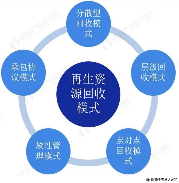 從再生資源回收模式來看,我國主要包括分散型回收模式、層級回收模式、點(diǎn)對點(diǎn)回收模式、軟性管理模式和承包協(xié)議模式五類。其中分散型回收模式是由大量分散回收者、小型初級拆解者、生產(chǎn)作坊,以及數(shù)個廢舊物資集散地組成,分散的回收人員將廢舊物資收集起來,經(jīng)過初級的分類拆解,到廢舊物資集散地出售,此模式最為常見。