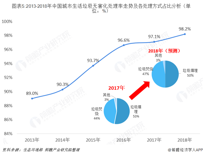 根據(jù)生態(tài)環(huán)境部數(shù)據(jù),2018年我國城市生活垃圾無害化處理率已接近100%,達到98.2%,其中垃圾填埋方式處理的生活垃圾比例預(yù)計較2017年有所下降,約為50%。由于土地資源緊缺,未來以填埋方式處理的生活垃圾比例將繼續(xù)下降,垃圾焚燒處理能力亟待不斷增強。