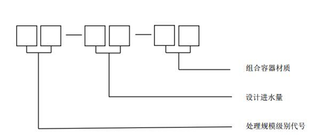 型號標(biāo)記方法由三部分組成,處理規(guī)模級別代號、設(shè)計進(jìn)水量、組合容器材質(zhì)。如下: