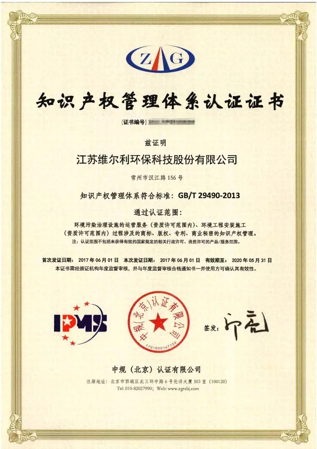 2017年6月,江蘇維爾利環(huán)保科技股份有限公司順利通過(guò)認(rèn)證,獲得GB/T29490-2013知識(shí)產(chǎn)權(quán)管理體系認(rèn)證證書(shū)。