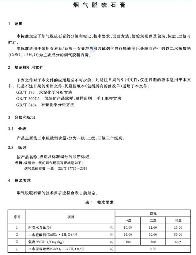 日前,國家標(biāo)準(zhǔn)委發(fā)布煙氣脫硫石膏(GB/T 37785-2019)國家標(biāo)準(zhǔn)。標(biāo)準(zhǔn)于2020年7月1日實施。標(biāo)準(zhǔn)適用于石灰石-石膏濕法對含硫煙氣進行脫硫凈化處理而產(chǎn)生的以二水硫酸鈣為主要成分的煙氣脫硫石膏。