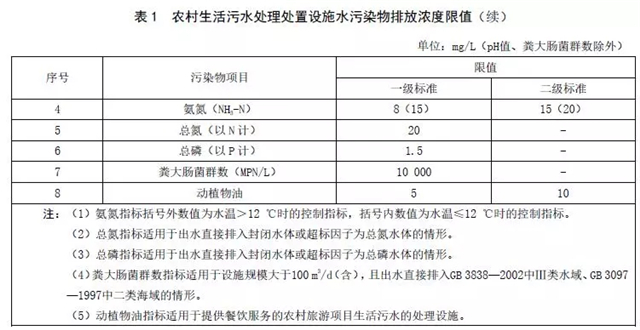 4.1.1 根據(jù)農(nóng)村生活污水處理處置設(shè)施規(guī)模和出水去向,將農(nóng)村生活污水處理處置設(shè)施水污染物排放標準分為一級標準和二級標準。