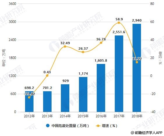 2012-2018年中國(guó)危廢處置量統(tǒng)計(jì)及增長(zhǎng)情況預(yù)測(cè)