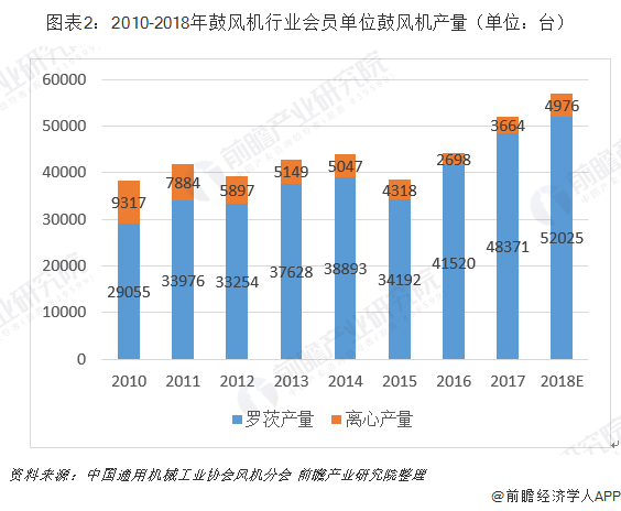 根據(jù)中國(guó)通用機(jī)械工業(yè)協(xié)會(huì)風(fēng)機(jī)分會(huì)統(tǒng)計(jì),2017年,協(xié)會(huì)會(huì)員單位羅茨鼓風(fēng)機(jī)產(chǎn)量為48371臺(tái),同比增長(zhǎng)16.5%;協(xié)會(huì)會(huì)員單位離心鼓風(fēng)機(jī)產(chǎn)量為3664臺(tái),同比增長(zhǎng)35.8%。據(jù)測(cè)算,2018年,協(xié)會(huì)會(huì)員單位鼓風(fēng)機(jī)產(chǎn)量合計(jì)達(dá)到5.7萬(wàn)臺(tái),同比增長(zhǎng)9.54%。