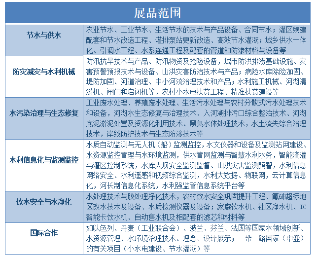 水環(huán)境治理技術的升級,必然帶來涉水行業(yè)服務模式的升級,傳統(tǒng)的商業(yè)模式已不能滿足新命題。在此背景下,水博會作為行業(yè)年度盛會,特別將此次輻射網(wǎng)延伸至節(jié)水與供水、防災減災與水利機械、水污染治理與生態(tài)修復、水利信息化與監(jiān)測監(jiān)控、飲水安全與水凈化、國際合作六大領域。具體如下圖所示:
