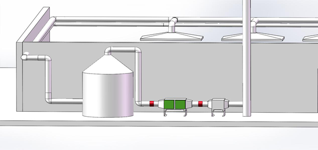 針對(duì)這種工況,草木綠設(shè)計(jì)的凈化方案是,淬火爐、回火爐廢氣在收集后,經(jīng)噴淋塔洗滌,再通過(guò)草木綠自主研發(fā)設(shè)計(jì)的雙極靜電式油霧凈化器進(jìn)行集中過(guò)濾,最后經(jīng)煙囪達(dá)標(biāo)排放??紤]到熱處理工序產(chǎn)生的廢氣帶有火苗,所以,草木綠設(shè)計(jì)加裝了防火罩、防火閥等防火措施。廢氣先經(jīng)噴淋塔洗滌,也能起到防火作用。