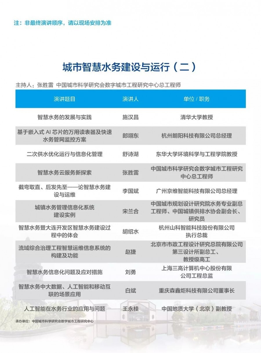 本次大會以推動我國水資源的可持續(xù)利用、水行業(yè)的健康發(fā)展以及水生態(tài)文明的貫徹落實為使命,依托廣博深厚的學(xué)術(shù)網(wǎng)絡(luò),已邀請到多位國內(nèi)外院士、國家相關(guān)部委領(lǐng)導(dǎo)國際組織首席科學(xué)家、水環(huán)境治理和城鎮(zhèn)水務(wù)領(lǐng)域頂尖研究院所專家和領(lǐng)先企業(yè)負(fù)責(zé)人就當(dāng)前國家政策、 經(jīng)濟(jì)形勢、技術(shù)創(chuàng)新、產(chǎn)品提升、運營管理、智慧平臺建設(shè)、大數(shù)據(jù)分析等城鎮(zhèn)水務(wù)與水環(huán)境治理前沿話題進(jìn)行學(xué)術(shù)探討交流。