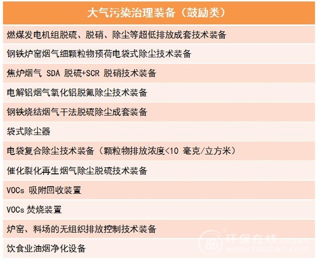 值得注意的是,《目錄》中將所鼓勵的“大氣污染治理裝備”自成一小節(jié),包括脫硫脫硝設(shè)備、除塵設(shè)備、無組織排放控制設(shè)備、油煙凈化設(shè)備等10余項。由此可見,環(huán)保未來將成為企業(yè)長久發(fā)展的一個戰(zhàn)略。具體鼓勵裝備如下: