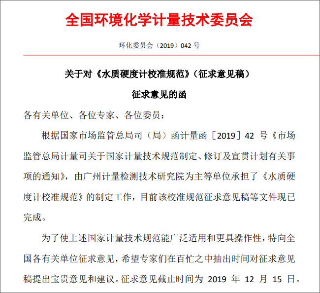 2019年11月9日,全國環(huán)境化學計量技術委員會發(fā)布《水質(zhì)硬度計校準規(guī)范》(征求意見稿),向全國各有關單位征求意見。